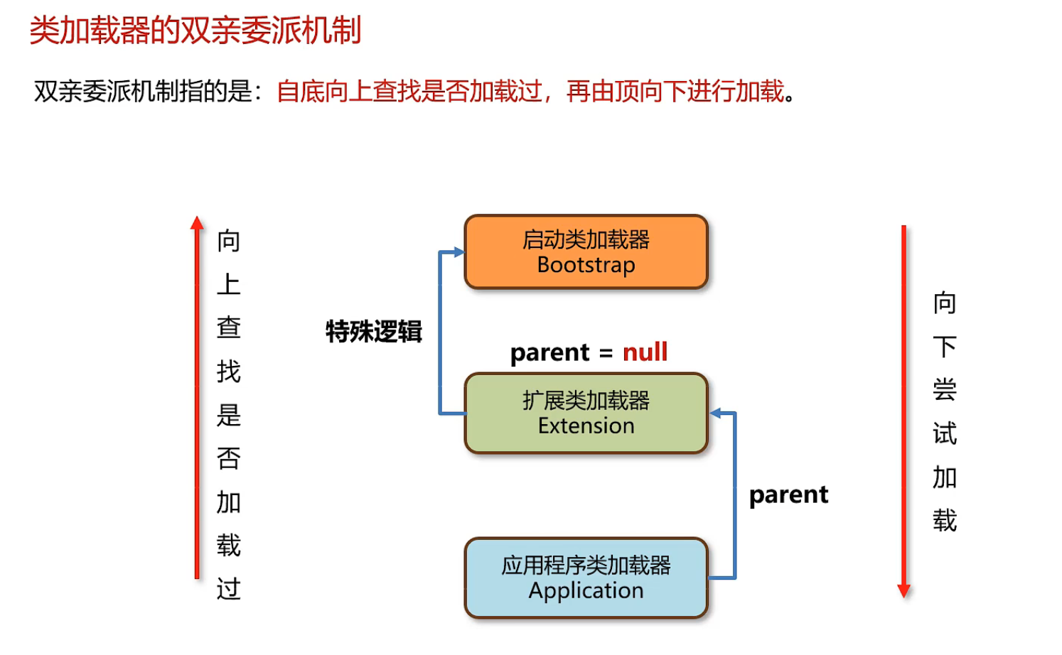 如果所有的父类都无法加载该类 则由当前类加载器自己尝试加载 所以看上去自顶向下尝试