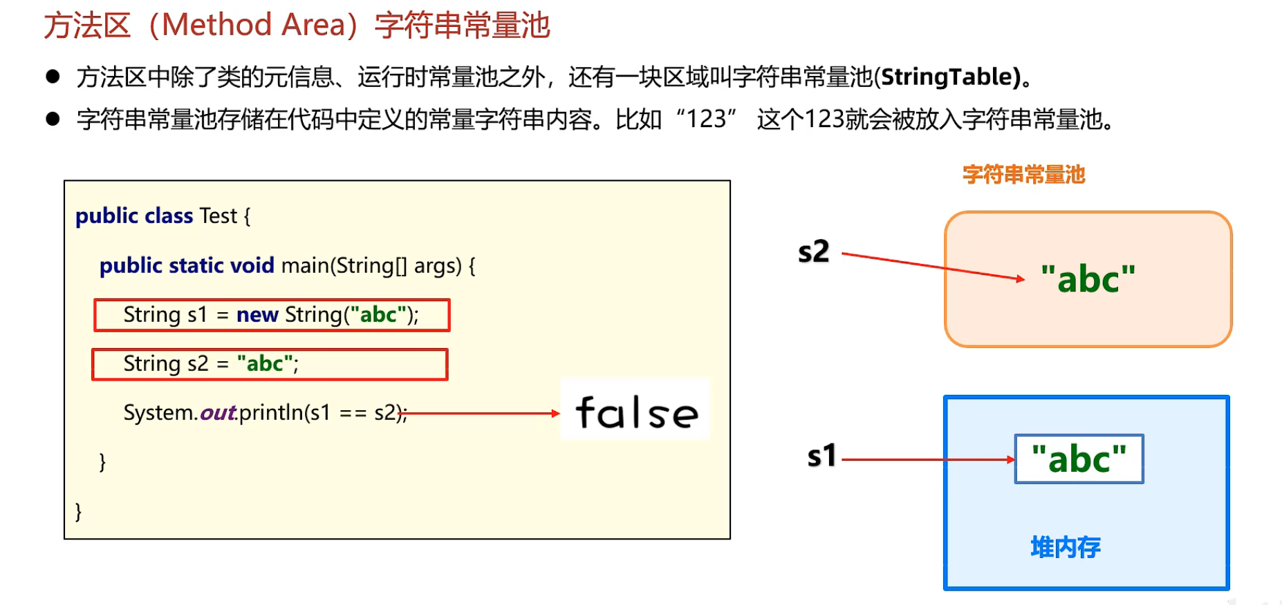 s2 并没有通过new关键字创建对象 s2存放的是字符串常量池中”abc”的地址