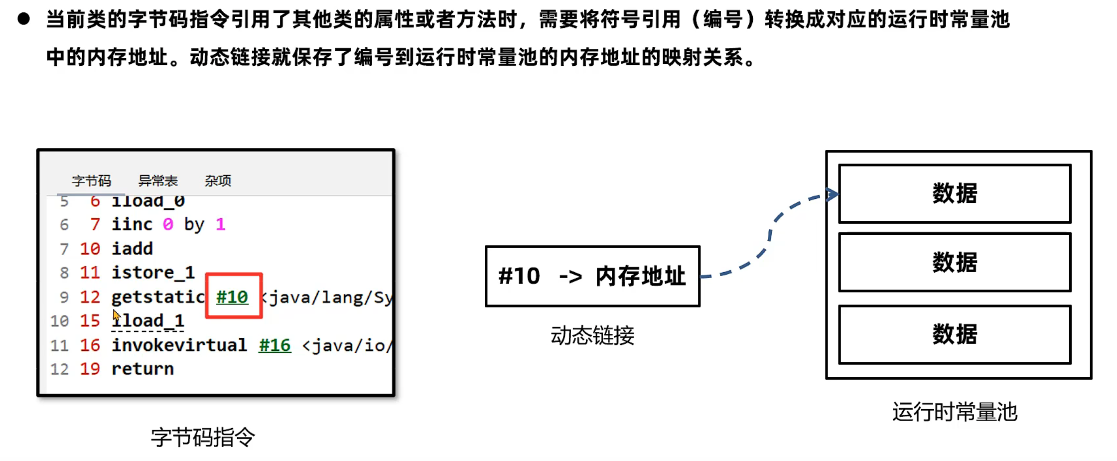 当前类的字节码指令引用了其他类的属性或者方法时 需要将符号引用(编号) 转换成对应的运行时常量池中的内存地址 动态链接就保存了编号到运行时常量池的内存地址的映射关系