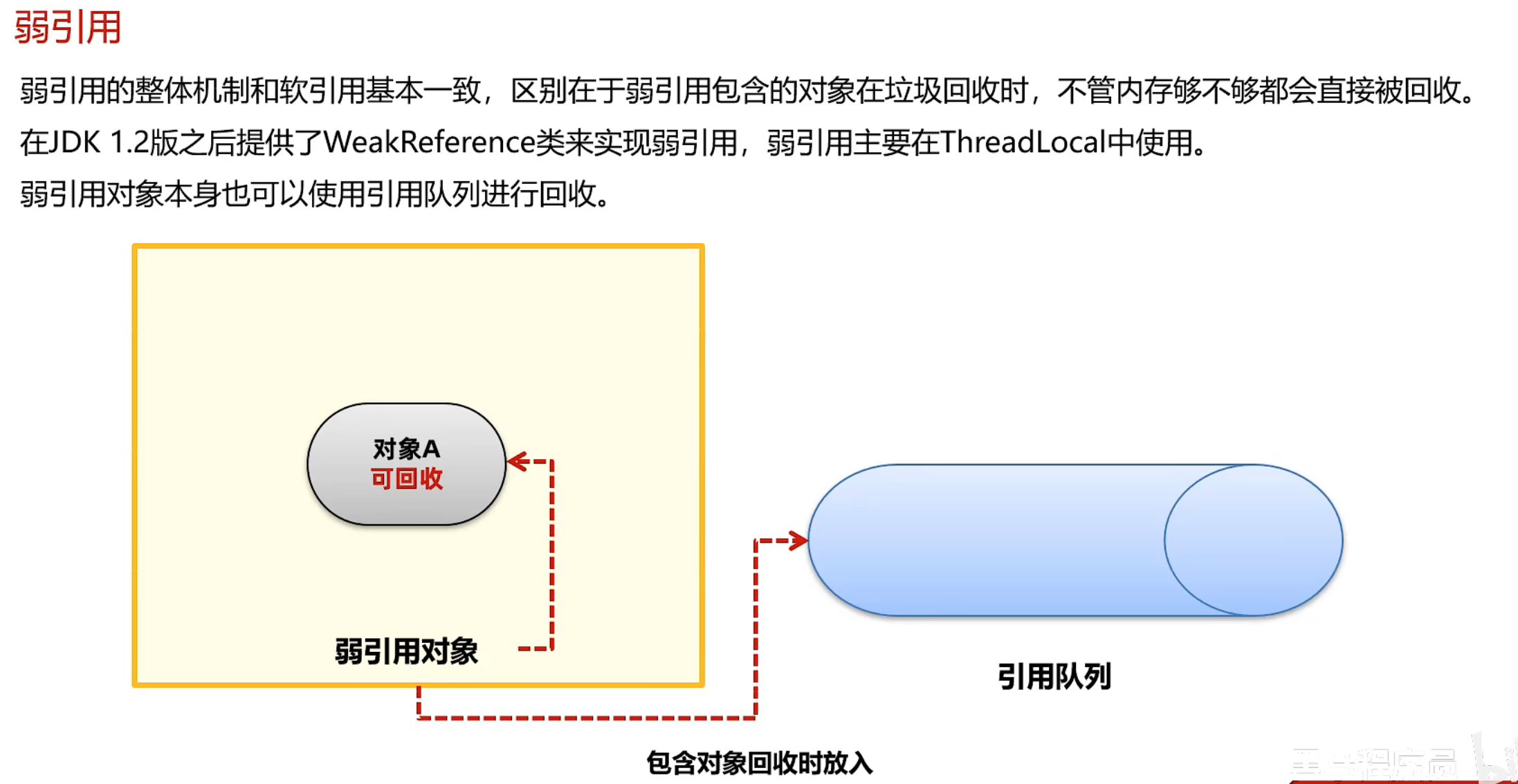 弱引用的整体机制和软引用基本一致 区别在于弱引用包含的对象在垃圾回收时 不管内存够不够都会直接被回收