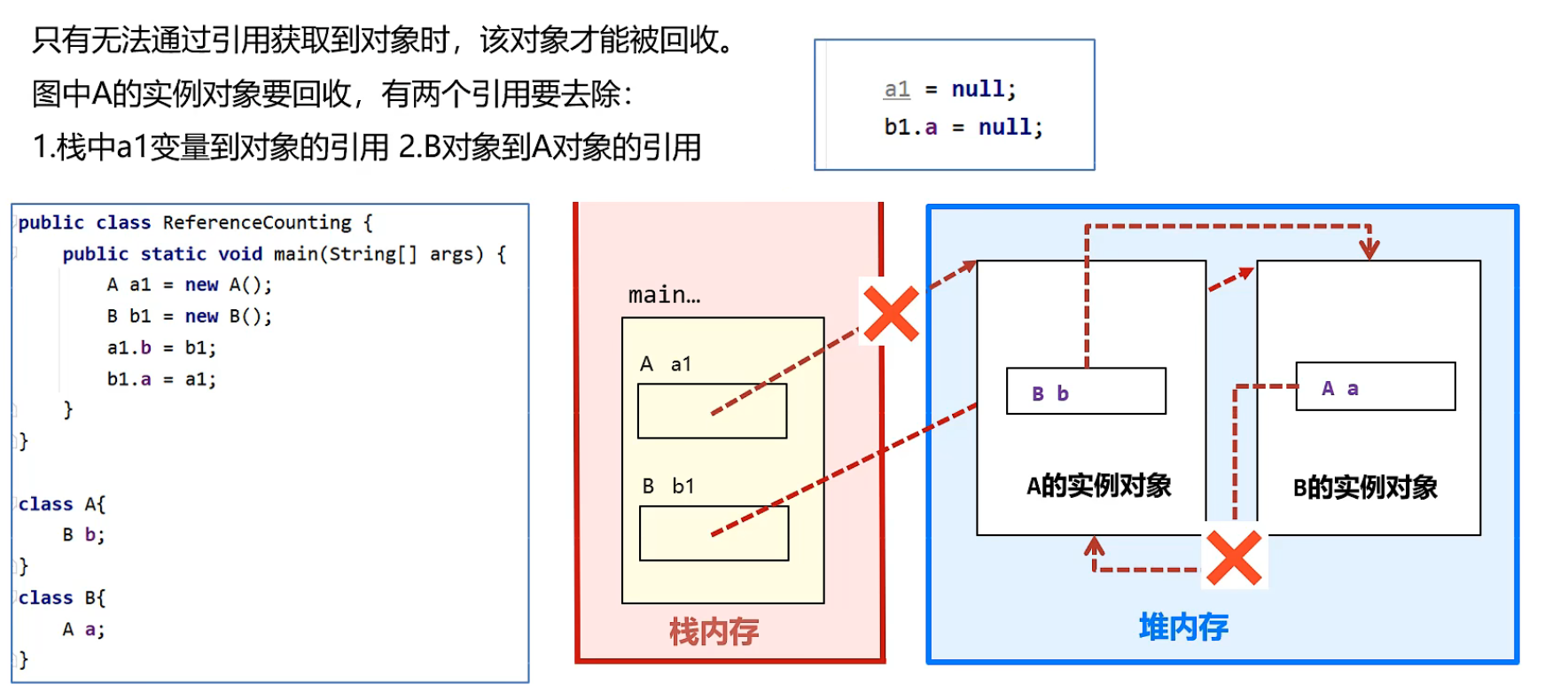 如果在main方法中最后执行 a1=null b1=null 是否能回收A和B对象?