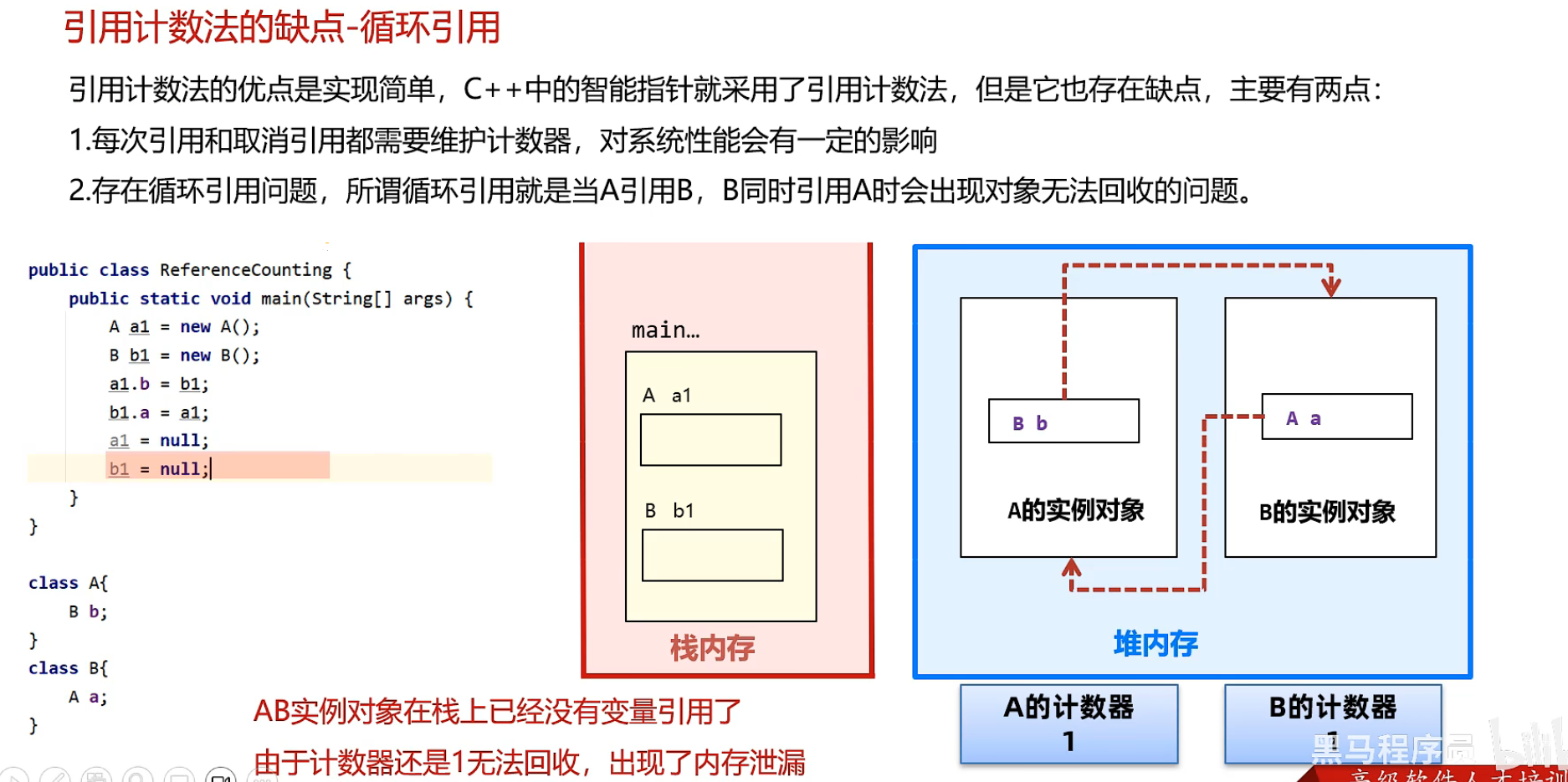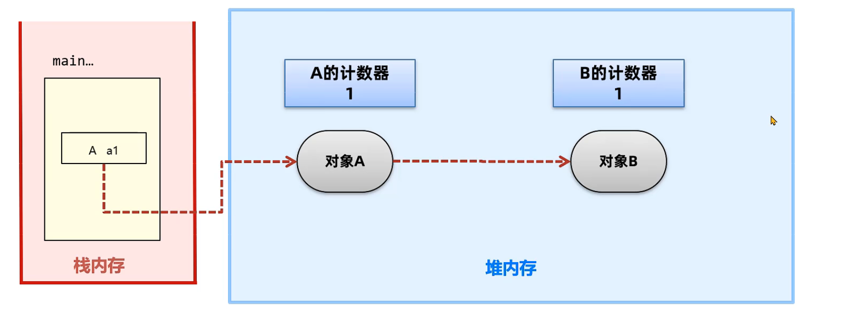 引用计数法会为每一个对象维护一个引用计数器 当对象被引用时+1 取消引用时-1