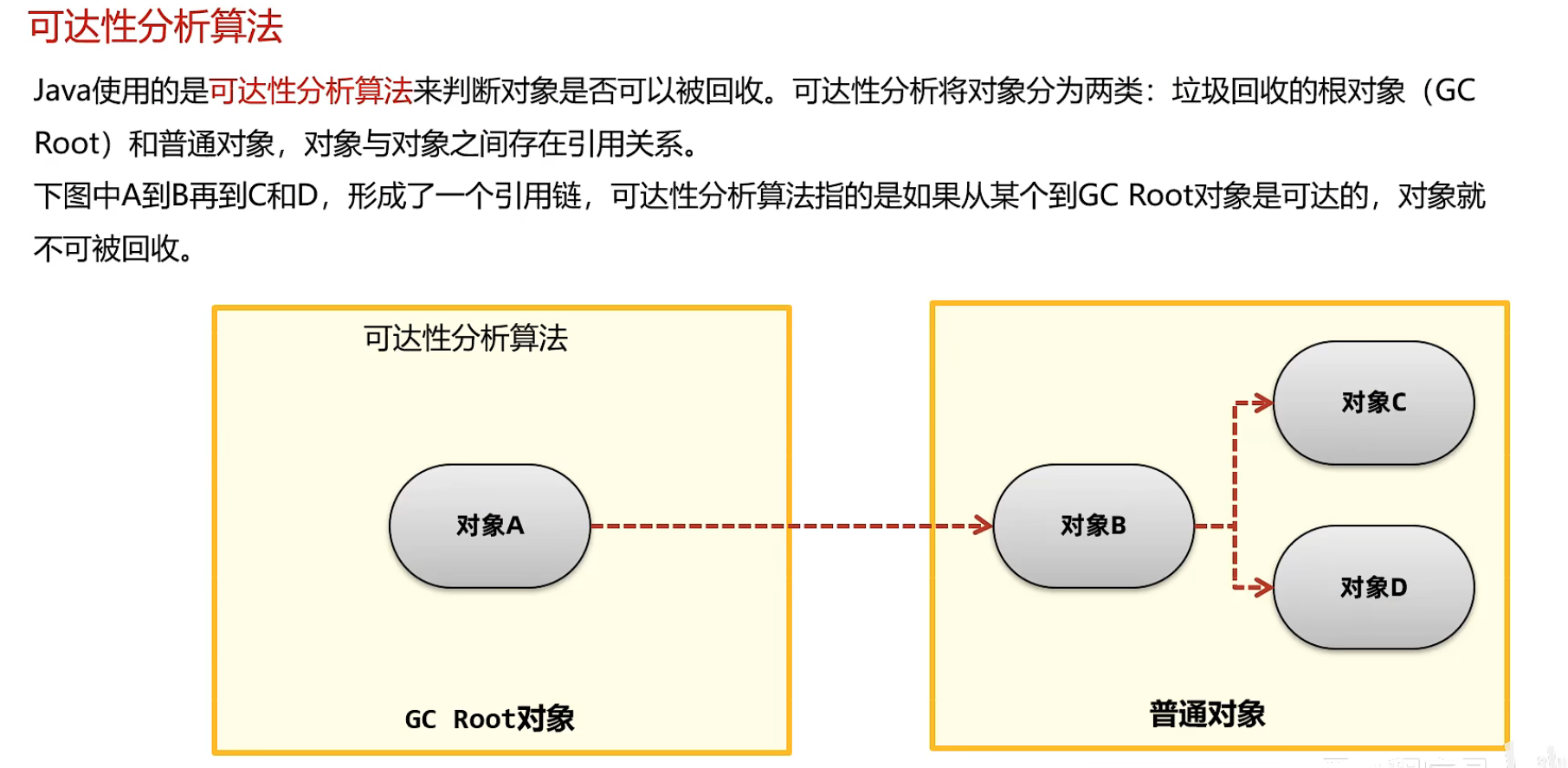 可达性算法中描述的对象引用 一般指的是强引用 即使GCRoot对象和普通对象有引用关系 只要这层关系存在 普通对象就不会被回收