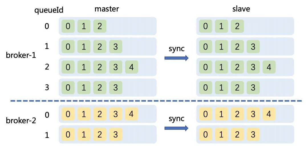 而queue作为实际消息的载体则是分布式存储在broker上 broker出于高可用考虑则也会采取主从分布的模式