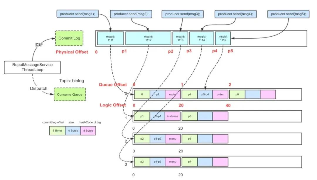 dispatch 线程会源源不断的将消息从 CommitLog 取出,再拿出消息在 CommitLog 中的物理偏移量 (相对于文件存储的 Index),消息长度以及Tag Hash 作为单条消息的索引,分发到对应的消费队列。偏移 + 长度构成了对 CommitLog 的引用 (Ref)。这种 Ref 机制对于单挑消息只有 20B,显著降低了索引存储开销。ConsumeQueue 实际写入的实现与 CommitLog 不同,CommitLog 有很多存储策略可以选择且混合存储,一个 ConsumeQueue 只会保存一个 Topic 的一个分区的索引,持久化默认使用 FileChannel