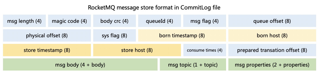 通过上图可以看到 rocketmq 在写入消息时 首先会先写到 commitlog中 然后将根据topic 生成索引(commitLogOffset、msgSize、tagsCode)写入具体的 ConsumerQueue中